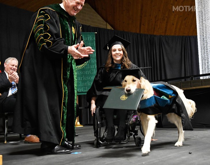 Куче добива магистратура за професионална терапија од Универзитетот Кларксон, бидејќи тоа присуствувало на сите предавања со својата сопственичка.