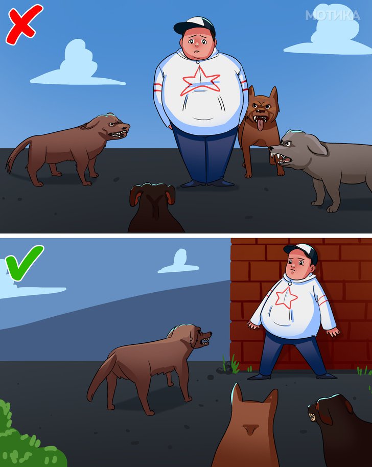 • Доколку ве нападнат повеќе кучиња, запомнете едно правило „Не треба да дозволите да ве опкружат“. Подобро е да застанете до ѕид или во некој агол. Исто така не треба да бегате.
