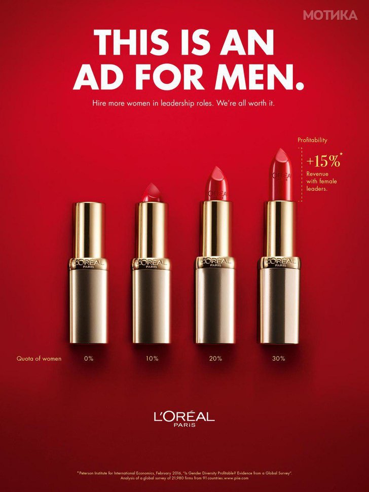 Во Германија 91,4% од менаџерските позиции ги имаат мажите. Компанијата L’Oreal Paris го анализираше истражувањето, чии резултати се прикажани во ваква „козметичка“ реклама за мажи.