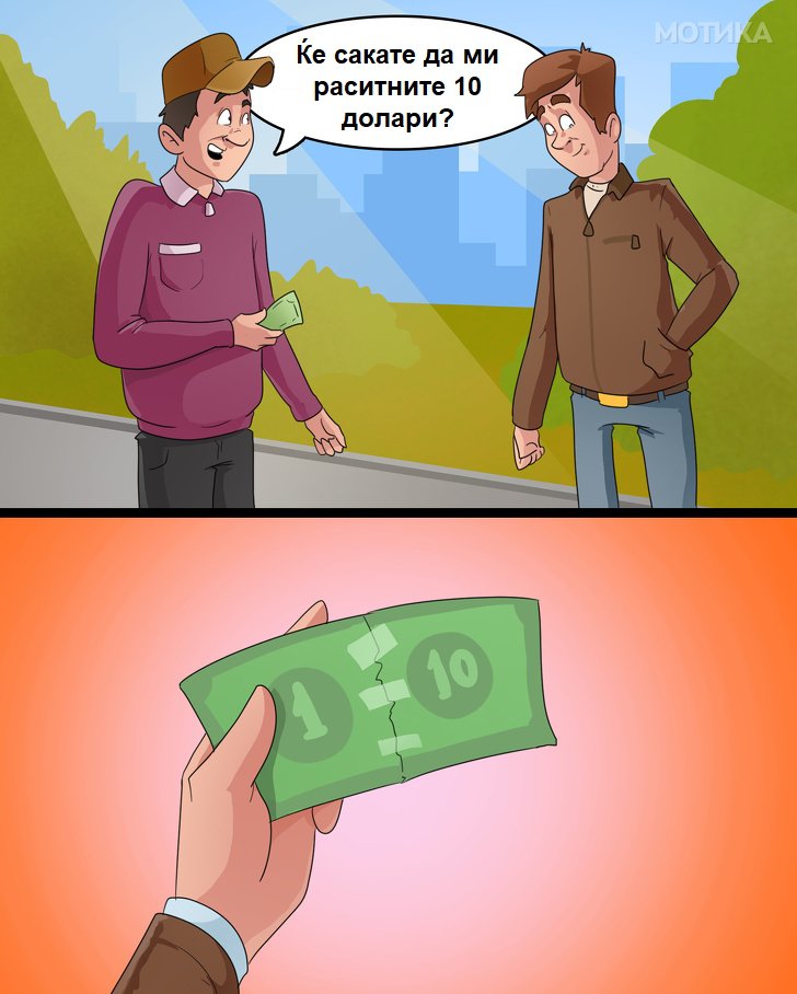 Човек ве сретнува на улица и ве замолува да му раситните пари, вие без проблем го правите тоа, а потоа забележувате дека парите се скинати или пак лажни.