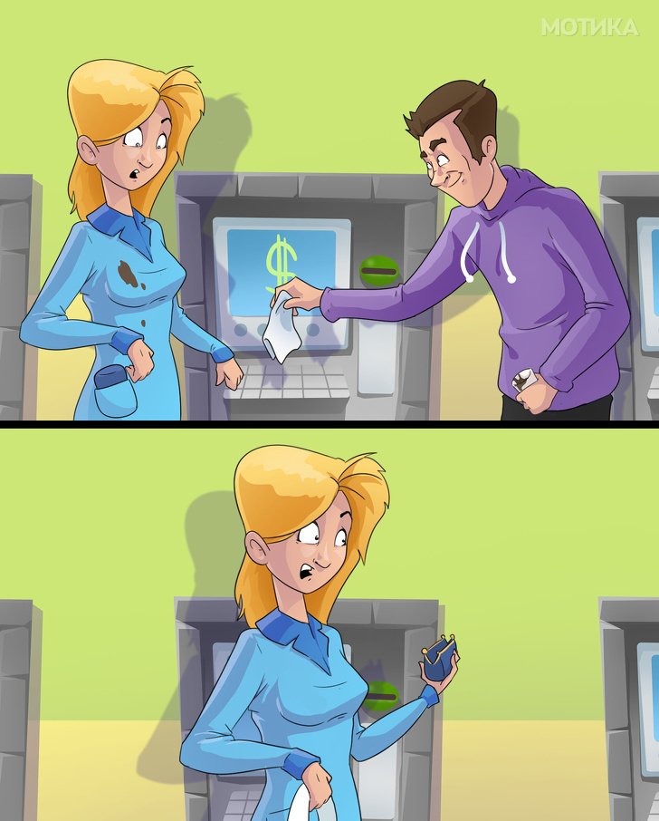 Пред банкоматот некоја личност случајно ве расипува со кафе, сладолед, сок или слично. Се понудува да ви помогне да се исчистите. Кога се замине ќе сфатите дека ви ја земал картичката или целиот паричник.