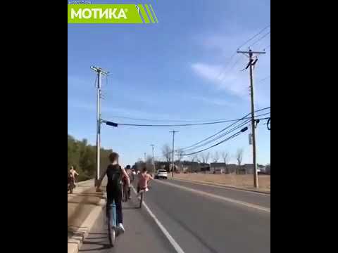 Будала вози велосипед на едно тркало директно во камионите и автомобилите