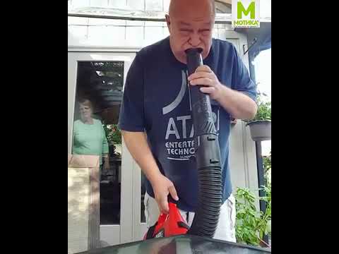 Дедото се забавува со новиот дувач на листови. Обратете внимание на бабата во позадина!