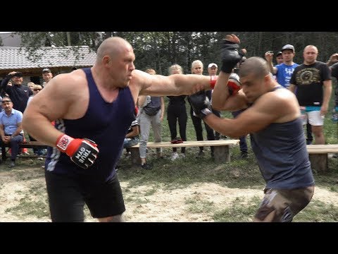 Професионалниот ММА борец Максим Новоселов против двајца улични тепачи. Тепачката започнува од 3:50.