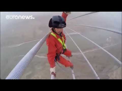Храбрите кинески работници за последен пат ги проверуваат каблите за струја на највисокиот далновод во светот