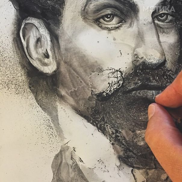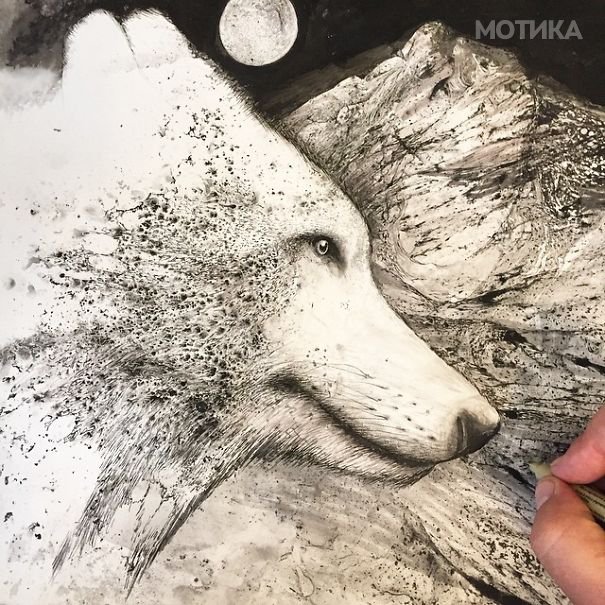 Моето студио е доста активно: истурам прскам и цртам. И потоа седам и гледам. И потоа употребувам пофини алаткиза да ги ослободам сликите кои секогаш биле таму. Јас сум таму секој ден и ги земам со себе хартиите, мастилото и „китот за хаос“, каде и да одам. Бескрајно сум фасциниран од новата техника којашто ми овозможува да си играм во оваа врска „поттурни-повлечи“.