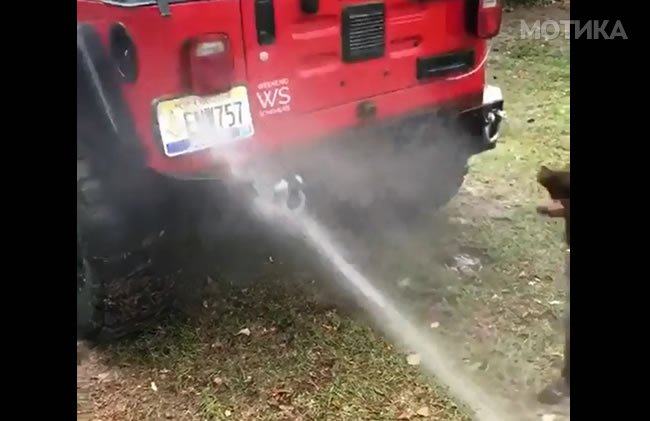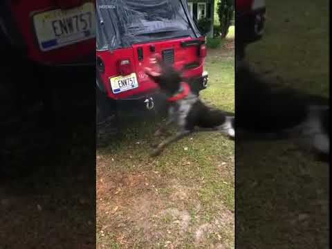 Кучето си најде предизвик, да се искапе со ладната вода од цревото, но не е така лесно.