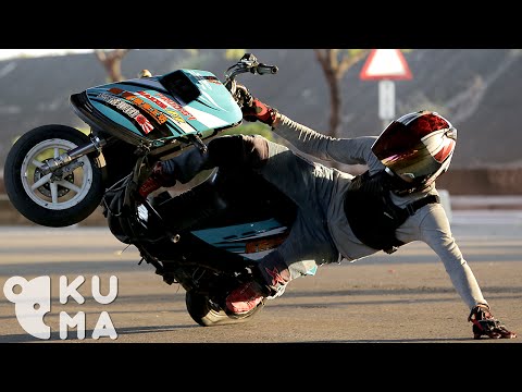 Дечкото е маестро за правење трикови на скутерче.