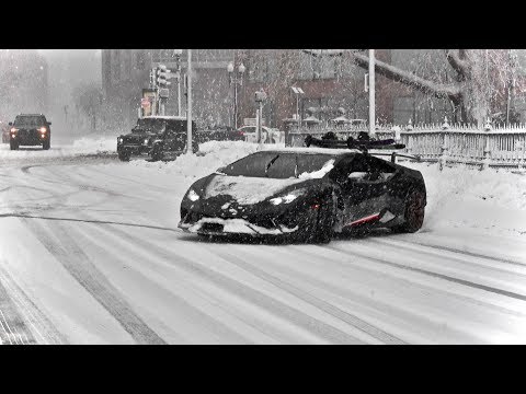 Лудување на снег со сноуборд врзан за Lamborghini Huracàn