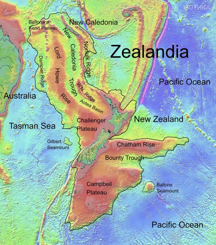 Научниците се сомневаат дека, како што континентот се одвоил од Австралија и Антарктикот пред околу 80 милиони години, тогаш стапил во акција еден синџир на настани кои на крајот кулминирале со тоа што копнената маса полека потонала под брановите, оставајќи ги само островите Нов Зеланд и неколку други врвови над површината. Ова може да помогне да се објасни како дел од дивиот свет во Јужниот Пацифик завршил таму каде што е денес и покрај тоа што е разделен со огромни делови на длабокиот океан.