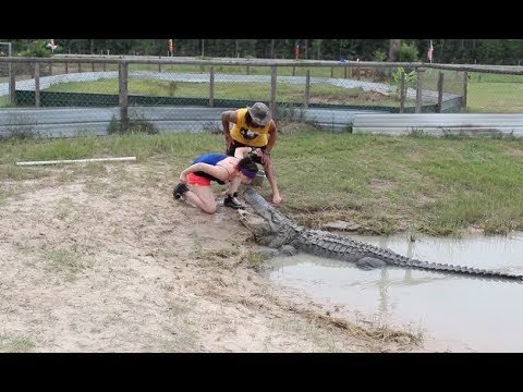 Каскадерка го ризикува нејзиниот живот за да го бакне алигаторот во муцката.