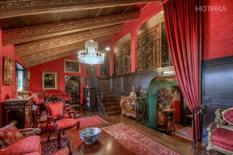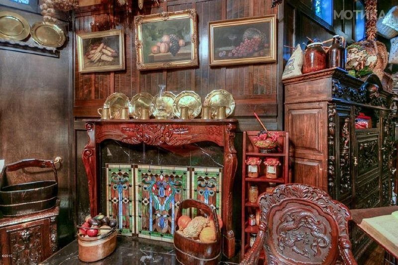 Големата црвена дневна соба има позлатени греди на таванот и дабов под со Јакубинска кафеава завршница. Трпезаријата се поврзува со еден дел од темнозеленото фоаје, а темната кујна обложена со дрво е сместена во позадината, скриена од останатиот дел на куќата. Вратите се дебели и рачно изрезбани. Прозорците се покриени со обоено стакло купено од стари англиски цркви.