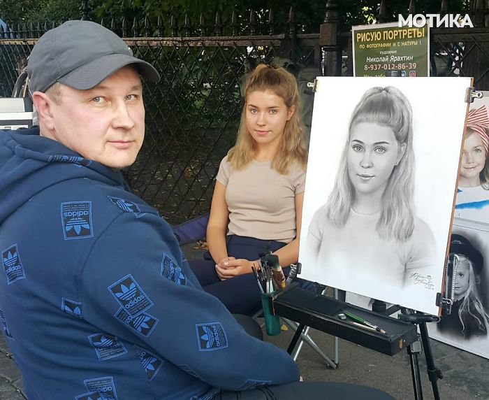 „Потребен ми е околу еден час да направам портрет. Гледајќи го воодушевувањето на моите клиенти како ги гледаат нивните портрети, ми носи многу радост и ме инспирира “, вели уметникот, кој запознал многу поголема и поразновидна публика на улиците на Санкт Петербург отколку што може било која галерија да опфати.