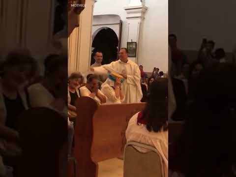 Свештеникот буквално ги истушира со светата вода од кофата, а особено жената која си ја покри главата.
