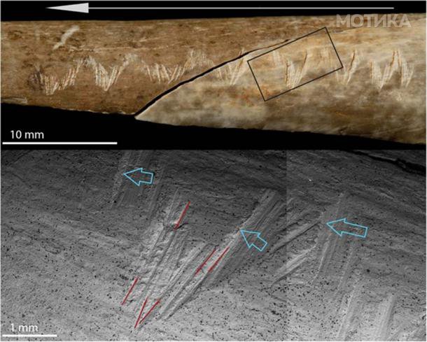 Една од пронајдените коски (десна подлактица) била откорната, џвакана, а потоа била „украсена“ со дезен пред да биде конечно скршена за да се извлече коскената срцевина. Научниците тврдат дека цик-цак дезенот не е направен при касапењето, туку дека е дел од уметноста на некој нивен ритуал. Покрај тоа, тие веруваат дека ознаките можат да бидат „наратив“ на животот на мртвите или можеби спомен за тоа како тие го загубиле својот живот.
