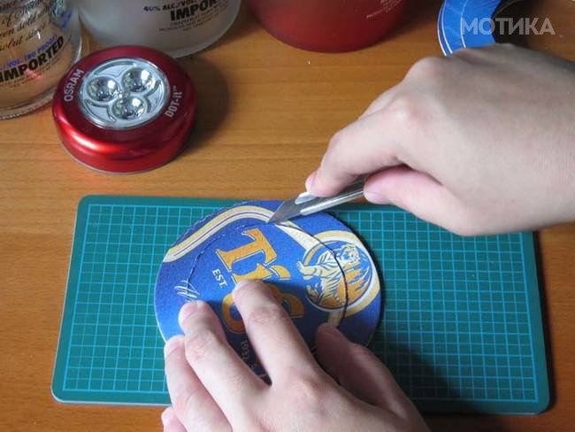 Потребни ви е празно стаклено шише, картонски подлошки, LED светилка и скалпел или ножици.