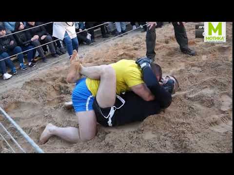 Камионџијата е тој понабилданиот во жолтото. Ваквите ММА тепачки во импровизиран ринг на песок на улица се многу популарни во Русија.