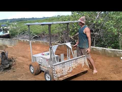 Покривот на булдожерот е соларен панел, кој е поврзан со 4 батерии од количка за голф.