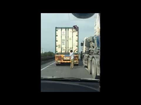 Некој од возачите ја приметил, па му сигнализирал на камионот да запре. Но како да се симне од толкава височина?