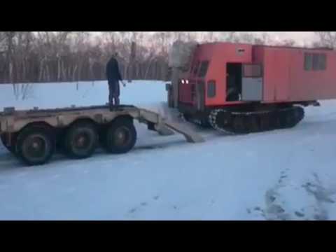 Упорен руски машинист качува градежна машина на камион за транспорт