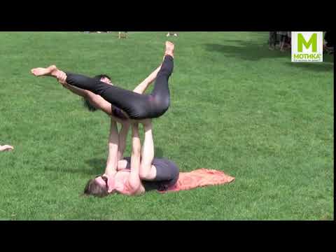 Вежбање јога со другарката во проѕирни хеланки во преполн парк