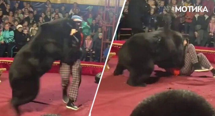 Претставата на еден циркус во Олонет, северо-источна Русија, не заврши со смеа и овации, туку со расплакани деца и врескање од ужас. 27-годишната мајка, Галина Гуриева го снимила индицентот и вели дека уште пред да се случи нешто била шокирана што нема никаква безбедносна ограда која би ја разделила публиката и огромната мечка.