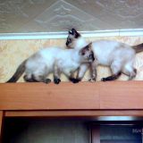 Две мачки се обидуваат да се разминат на многу тесен просто, над...
